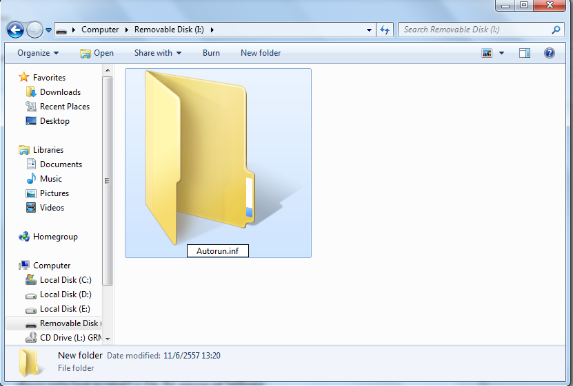 2 .พิมพ์ชื่อ Folder ว่า Autorun.inf ขอย้ำว่าชื่อ Folder ไม่ใช่ชื่อ File ซึ่งวิธีนี้อาจทำให้ไวรัสรู้สึกหงุดหงิด เนื่องจากมันไม่สามารถสร้าง File ชื่อ autorun.inf ได้อีกต่อ ดังภาพต่อไปนี้